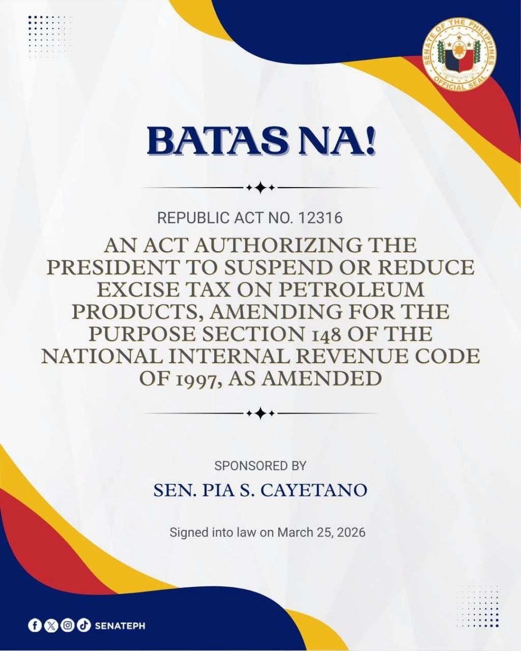 President Marcos signed RA 12316 allowing suspension of fuel excise taxes when Dubai crude hits $80/barrel, with strict limits and transparency requirements.