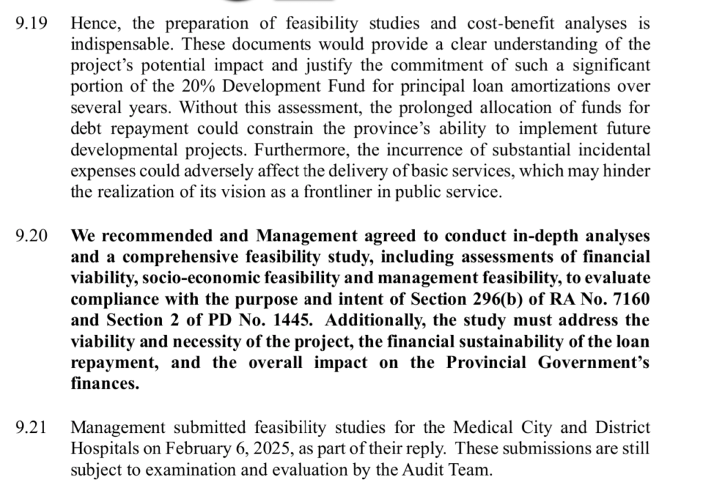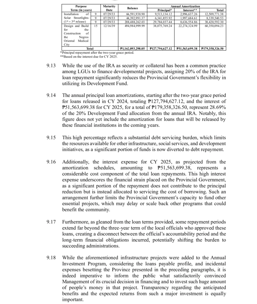 The Commission on Audit itself records that there was no feasibility study. No cost-benefit analysis. No clear assessment of the province’s capacity to repay. Twenty percent of the National Tax Allotment was assigned directly to banks. And the decision will impose a severe and lasting financial burden on the province in the years to come.