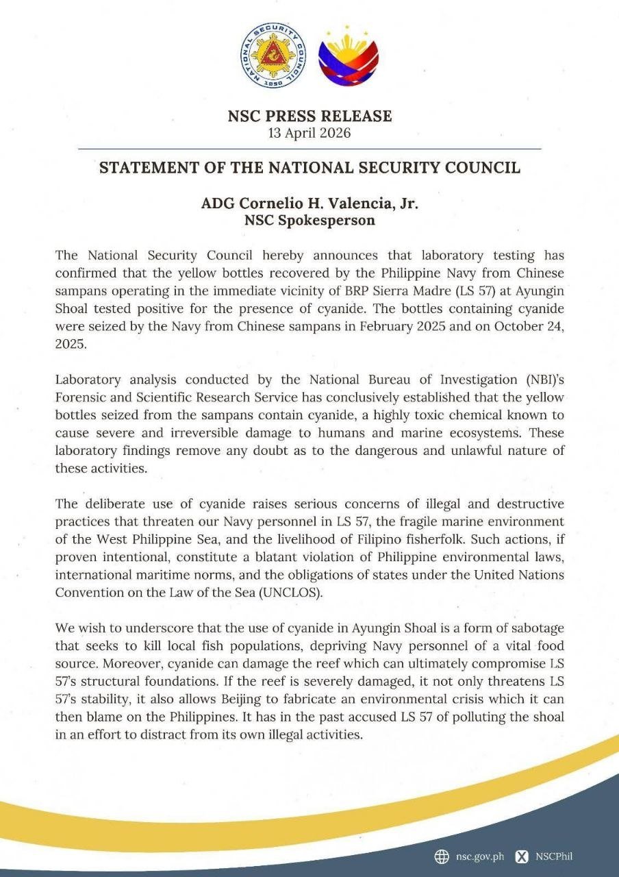 Laboratory tests have definitively proven that Chinese fishing boats deployed toxic cyanide chemicals in waters surrounding Ayungin Shoal, creating unprecedented environmental and security threats in the West Philippine Sea, the National Security Council announced.