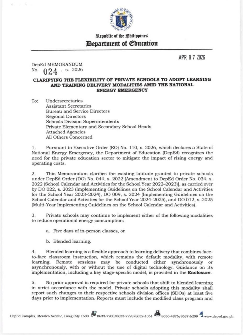 The authorization, detailed in Department of Education (DepEd) Memorandum No. 024, s. 2026 dated April 7, 2026, reinforces existing flexibility provisions under earlier department directives while specifically addressing energy consumption challenges faced by private schools.