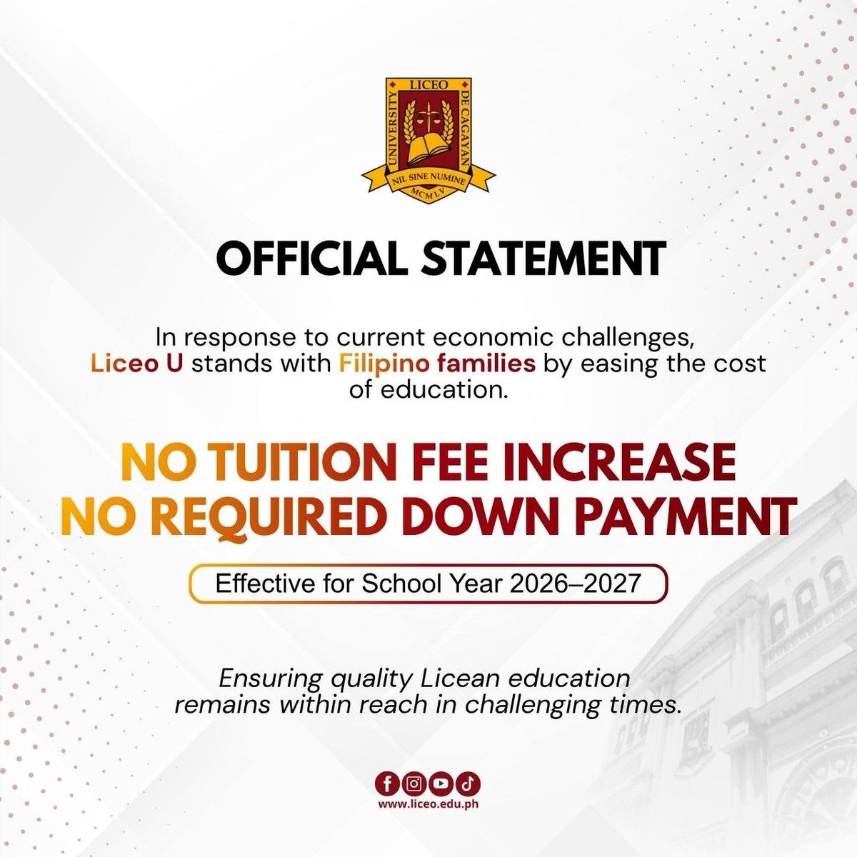 In response to mounting financial pressures facing Filipino households, Liceo de Cagayan University has declared it will maintain current tuition rates and remove down payment obligations for students enrolling in the 2026-2027 academic term.