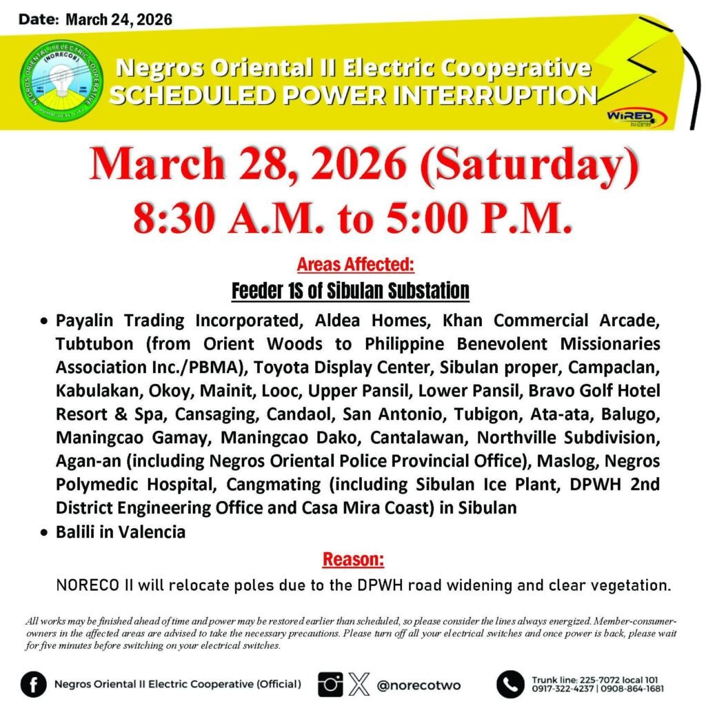 The Negros Oriental II Electric Cooperative (NORECO II) has announced a scheduled power interruption affecting areas in Sibulan and Valencia on Saturday, March 28, 2026. The outage is scheduled to last from 8:30 A.M. to 5:00 P.M. and is necessary for the relocation of poles due to the Department of Public Works and Highways (DPWH) road widening project and vegetation clearing activities.