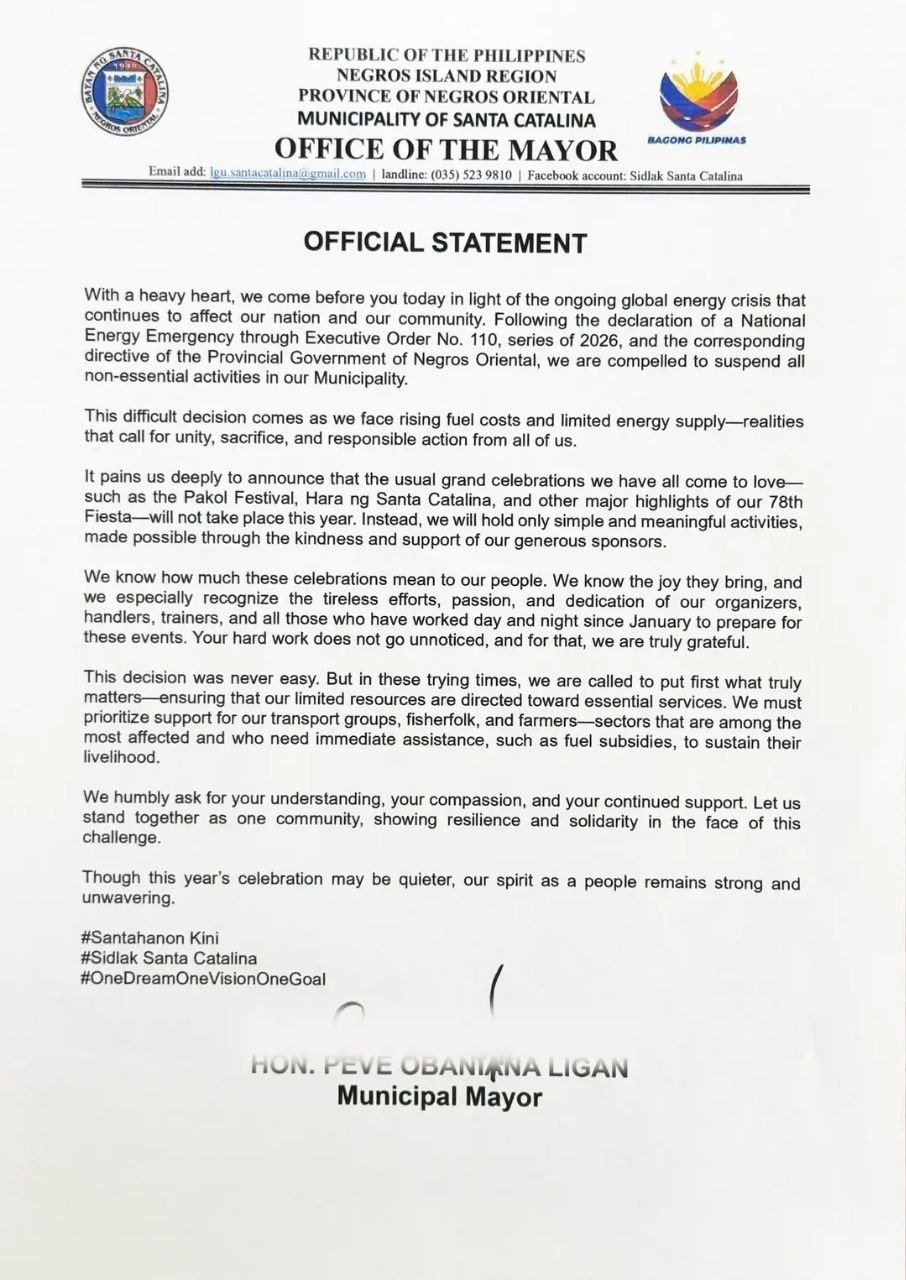 The municipality of Santa Catalina in Negros Oriental has decided to forego its traditional 78th Municipal Fiesta celebrations, including the much-awaited Pakol Festival, as the community grapples with the effects of the nationwide energy emergency and escalating fuel prices.