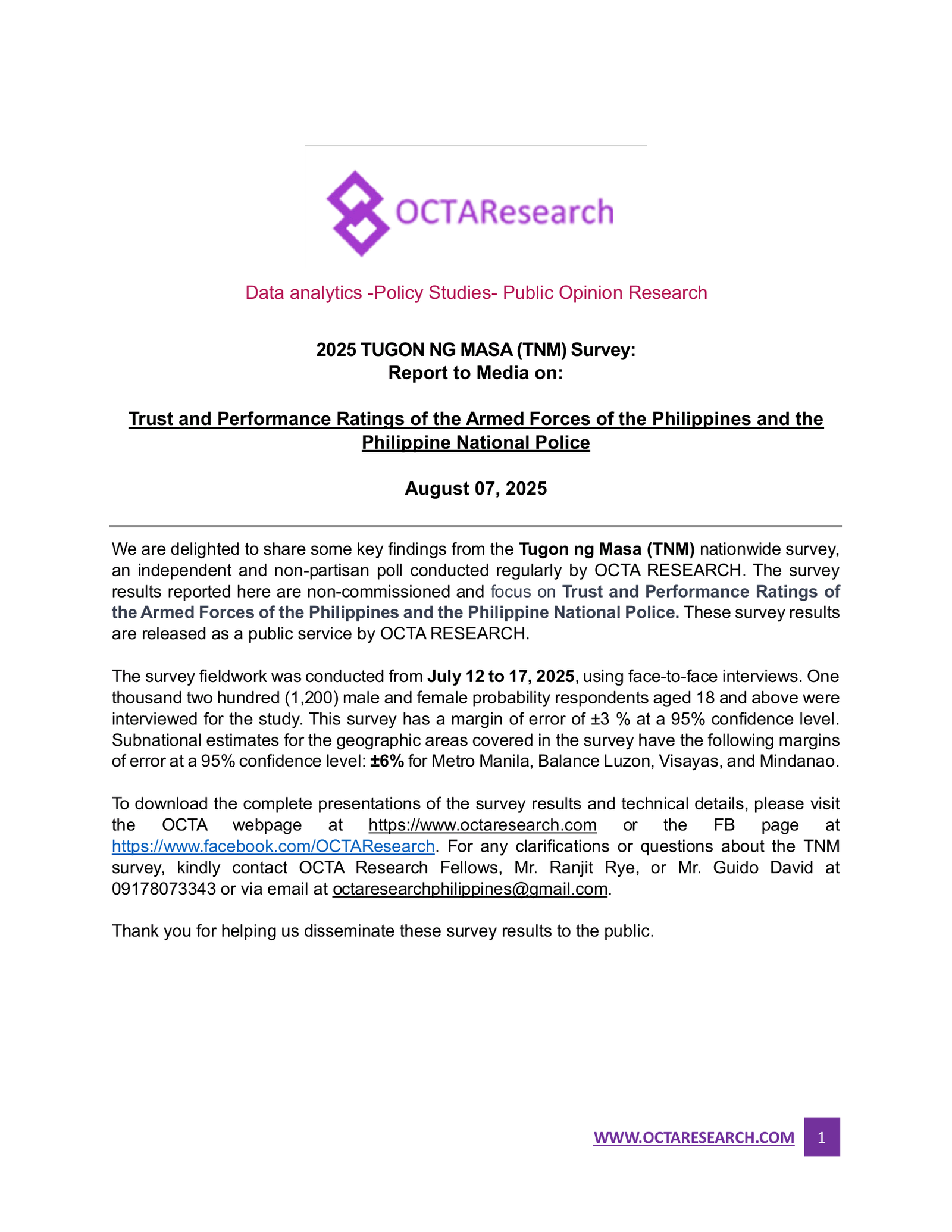 Survey Shows AFP and PNP Remain Most Trusted Government Institutions in the PhilippinesPublished: August 7, 2025By OCTA Research MANILA — The Armed Forces of the Philippines (AFP) and the Philippine National Police (PNP) continue to enjoy high public trust and satisfaction, according to the latest Tugon ng Masa Second Quarter 2025 Survey released by OCTA […]